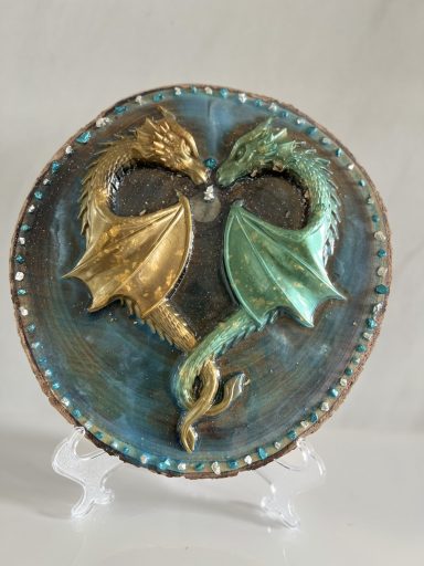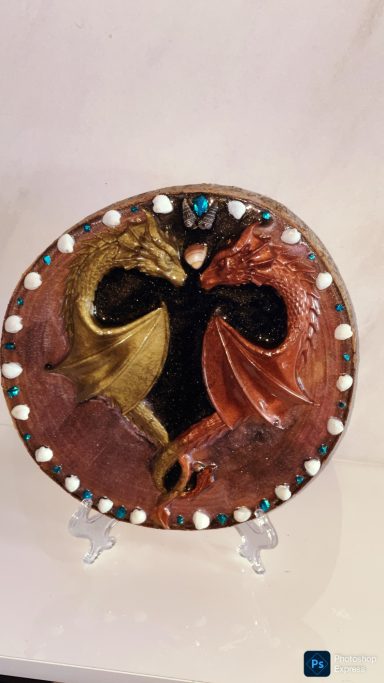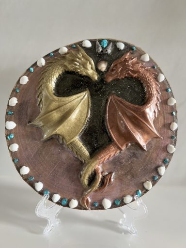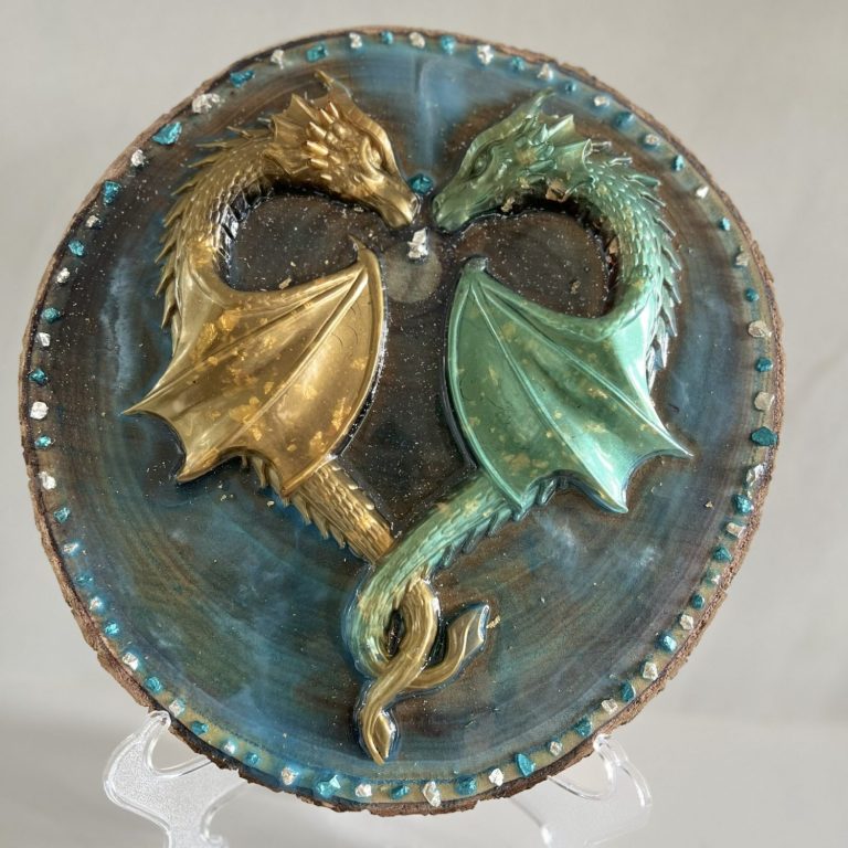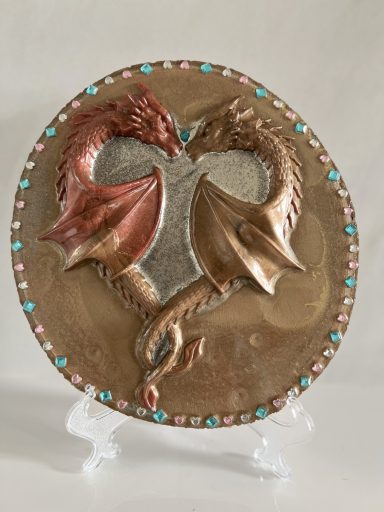 Born from a vision of harmony and strength, our Twin Dragon Heart Plaques capture the timeless dance of two dragons entwined in a heart — a symbol of love, unity, and protection. Each handcrafted piece glimmers with metallic tones of bronze, gold, and copper, finished with jewel-like accents that make every plaque unique.